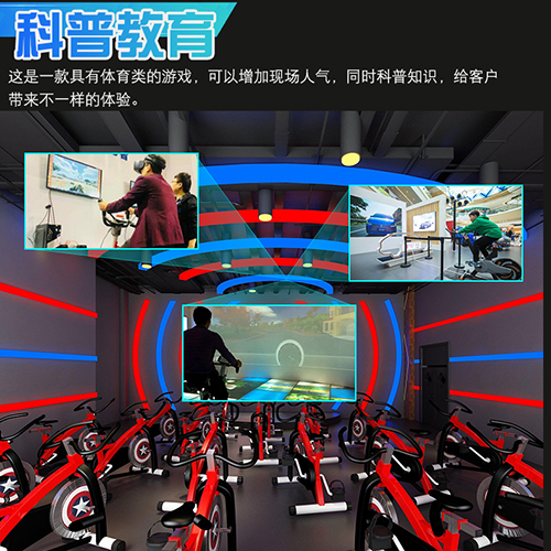 VR動感單車,競技+健身,沉浸式體驗,仿真自行車外觀,場景化內容設計與騎行動作實現精確銜接。